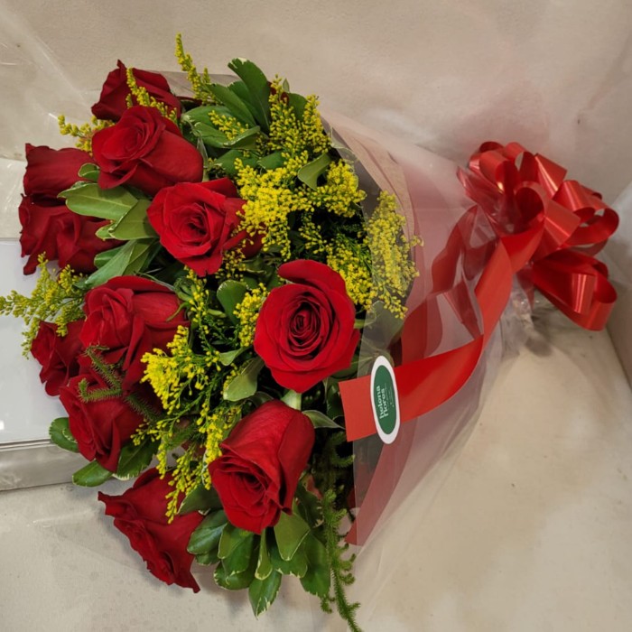 12 Rosas Colombiana vermelha folhagem verde e tango, Embalagem e laço